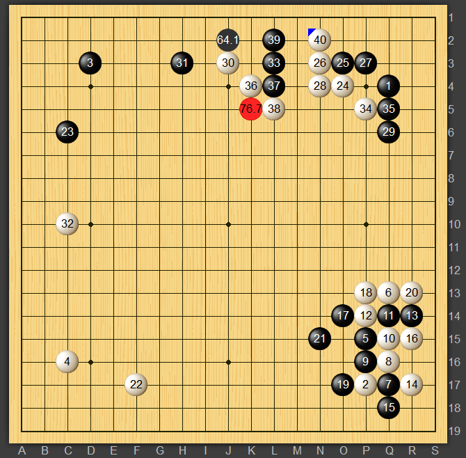 こんにちは、Babbです。今回も野狐三段戦の解説をしていきたいと思います。今局は第二局の直後に打っています。序盤で終わってしまい悔しかったので連戦いたしました。私の黒番です。今局はお互い小目を打ち合いスタート、右下隅は一間バサミからの懐かしい定石が登場しました。黒21はシマリと迷いましたが21にカケツギました。足は遅い気がしましたが前局の記憶が残っていたので手厚くいきました lol