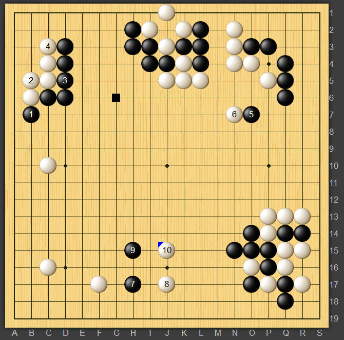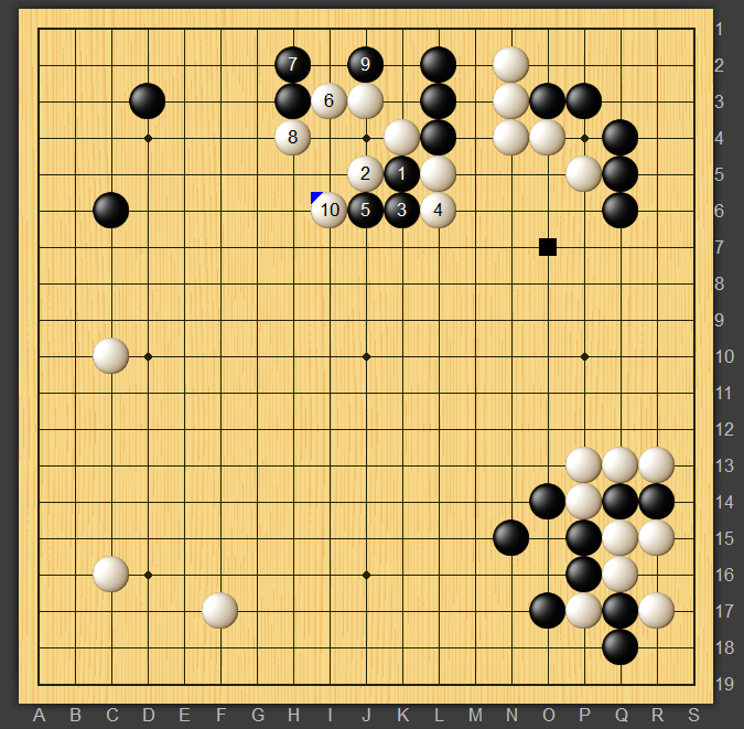 ちなみに黒7,9のワタリを止めると打ち込んだ三石を捨てて黒の外勢がすごいことになりそうです。なんだか星に子ゲイマにカカった後の三間ビラキに打ち込んだ定石と似ていますね。