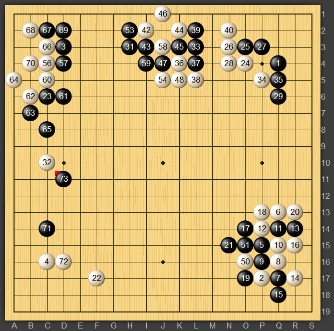 実戦は白72と左下隅を受けたので黒73とカタツキから持っていきました。こうして見ると上辺の白へもまだ寄り付けそうですね(出ギリがなければ)。