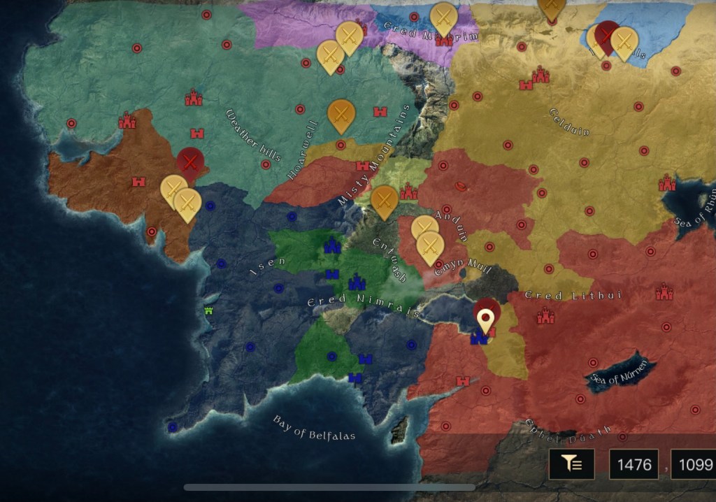 前述の戦争は主にマップの南東で行われていました。そちら側は我々が敗北する形で停戦、次は西南から北上を目指すべくアイゼンガルドという国に侵攻しました。タウル・ヤウラという土地を彼らから奪取し、さらに北上を試みたところ猛反撃を受けました。急な展開に驚きましたがそれもそのはず、そこにはなぜかアイゼンガルド、モルドール、エレボール、アルノールという四つの国のプレイヤーが集結しておりました、、、、