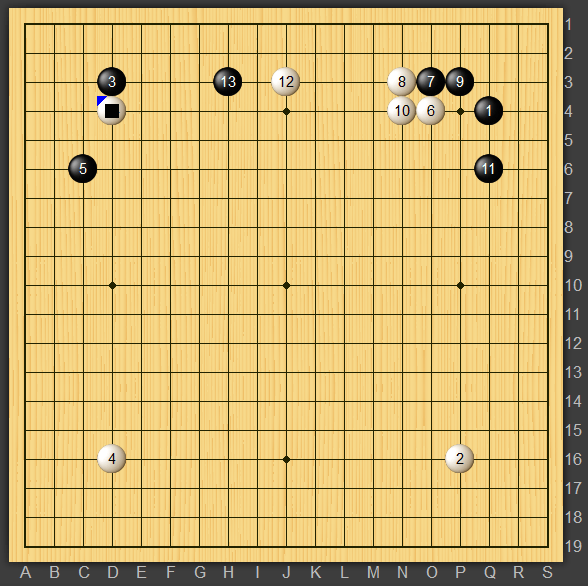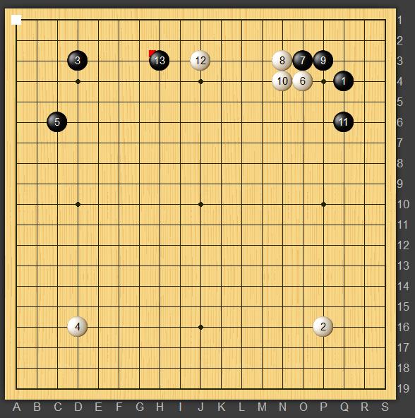 私が黒番で黒13といきなりツめていきました。下辺の三三が評価値は高いことは流石に学びましたが前回勉強した打ち込みから切っていく変化をやってみたいと思いトライしております。