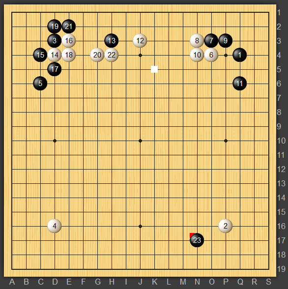 とは言え普通に受けてワタリが残ったので黒23のカカリに回りました。上辺は右上隅からのハネツギもあるしとりあえず保留しました。