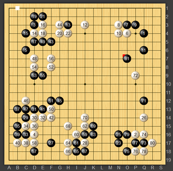 さて次の狙いは右下の三三、いきなりいっても良かった気がしますが黒71とツメて準備をしました。ただここで冷静にサガリを打たれたら狙いはなくなってしまっていましたね。それなら白26にツケたり黒71からケイマして中央から右辺を盛り上げていく展開になりそうです。実戦は白72と挟んできたので三々入り、白も回りに黒が多いとみて74の方向から受け、白地を凹ましたのである程度満足な別れだと思います。その後黒81と白72を孤立させにいったのですが、、