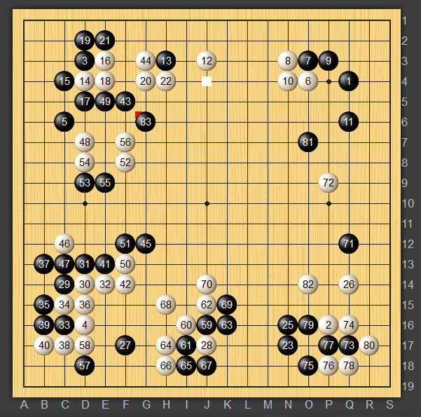 黒71が逃げ出す展開だと嫌な感じがしたので黒83ととりあえず左辺の白四子を脅かしに行きました。