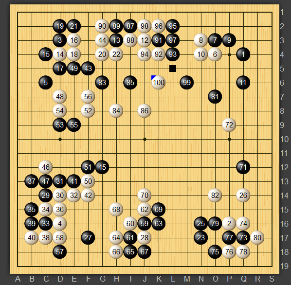 一応黒95のカケツギが三子の引っ張り出しと右下隅との連絡を見合いにしているという主張。結果的にツケヒキの三子を飲み込む形になりこれは成功と思います。ツケた石が取られても黒が厚くなれば左辺の白石を脅かしつつ黒71対白72への援軍を準備できるのではないかと思って打っていました。