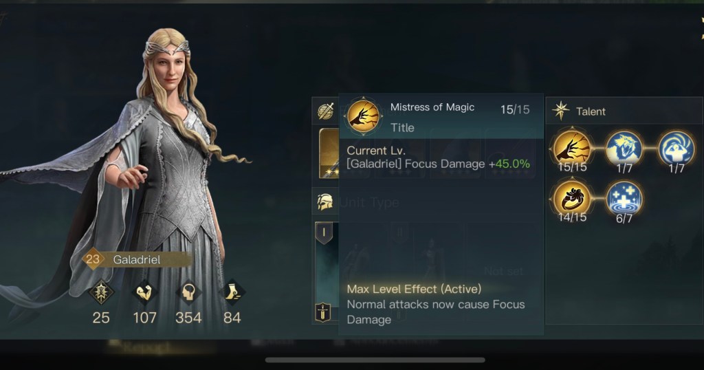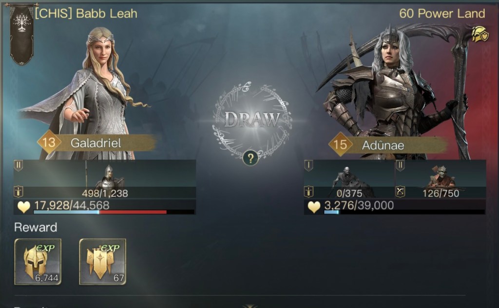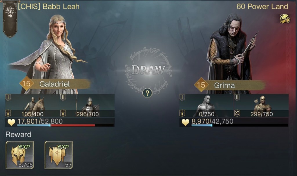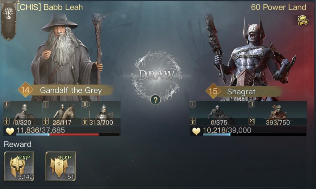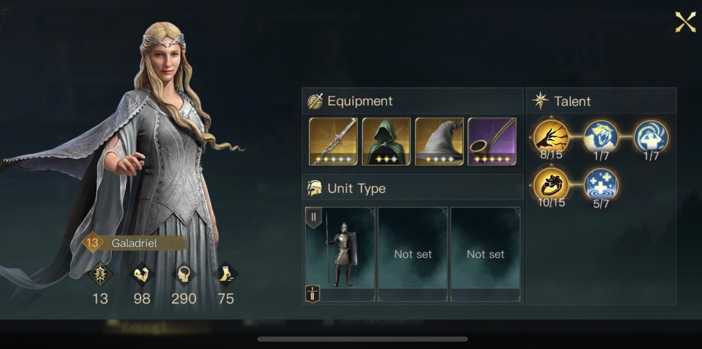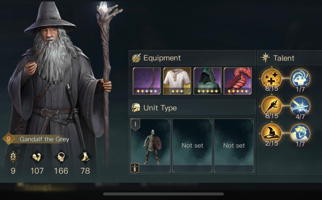 初期位置以外にも不安要素がありまして、まずはガンダルフの装備とスキルです。遠隔特化の装備を強化中で付けているのですが、ゴンドールではしばらく遠隔部隊が使えません。後々交換するのも億劫だと思い最初から装備させていました。あとスキルは本来は灰色の魔法使いをMAXにするのが良いのですが対人戦の際に変更する必要があります。スキルの振り直しはgemが必要なのでこちらもMAXにはしていませんでした。