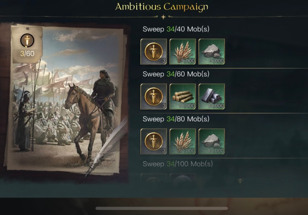 大抵途中で資源がなくなってやることがなくなりボーナスタイム終了、、というオチになることが多いです。とにかく資源をキープし続けることを意識しました。最初の頃はシーズンチャプターというクエストをクリアしていくことで資源が大量に貰えるのでそこを重点的にこなしていくと言うことですね。結局1と同じことかもしれませんがなるべくAPは資源調達に使う、穀物はモブ狩りで賄う等を試してみました。