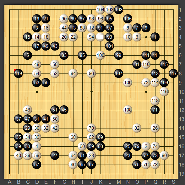 今回は上記の記事野狐三段戦第五戦から左辺を黒119とワタった所をみていきたいと思います。部分的には119のケイマが筋でワタれています。