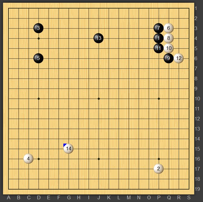 今回はネット碁あるあるが起きたので紹介していきたいと思います。私の白番で右上隅の三三に入って黒が13とヒラいた所です。