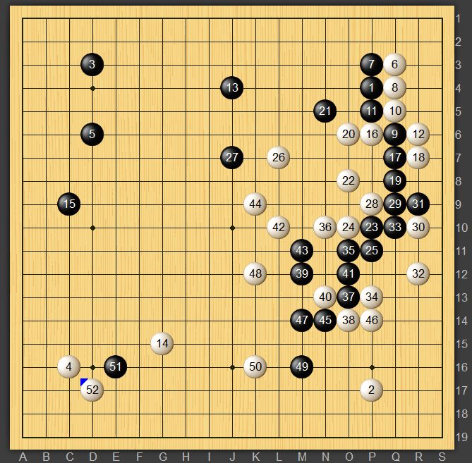 その後戦いになり、黒51とかかってきました。白14を活かしたいところですがどう打っていいか全くわかりませんでした。パッとしないとは思いつつも白52とコスミ。
