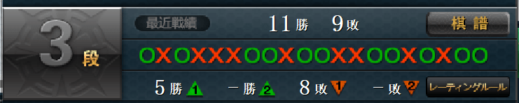 ちなみに現在勝敗が表示される上限の20局打って11勝9敗、三段キープとなっております。