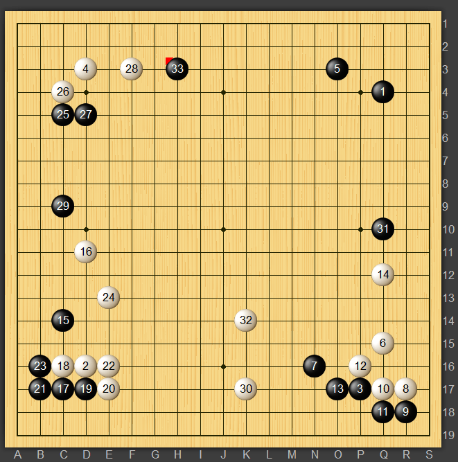 こう実戦のようにワタラせるしかないのですが白18と分断した石が働かないので黒が良いと本で読みました(今はどうなんでしょう)。その後白30,黒31,と大場をしめて、白32と下辺を広げてきました。黒は33と左上隅を占めました。