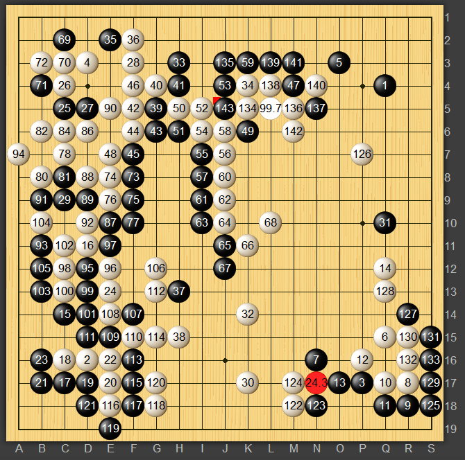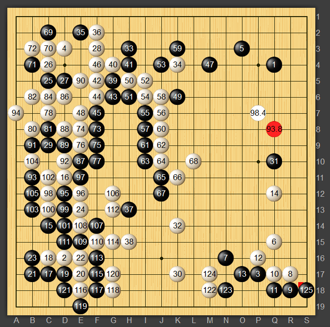 実は私この時点では形勢が良いと思っていました。だだ実際は勝率20%ほどだった様です。まあおそらく5目くらいの差でしょう。勝率は0.01%くらいにならないと私レベルだと気になりませんね lol