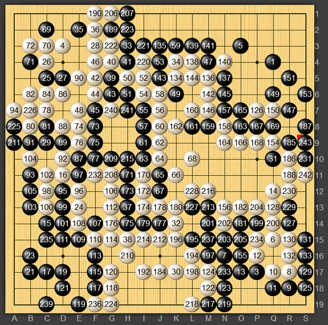 少し進んで上辺を黒143と三子をアタリにした場面、ツギは当然だと想っていましたがここで右下隅のサシコミを打たれていたら逆転されていた様です。