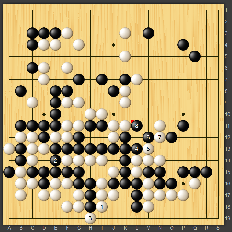 正解としては、白1と下がっていれば流石に黒2と繋がるほか無いでしょうから白も3とワタルぐらいでしょうか。4,5,6,7,8とさらに攻めるのは流石に無理そうなので四子捨てて右辺勝負といったところでしょうか。