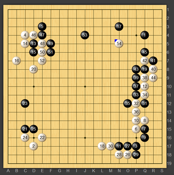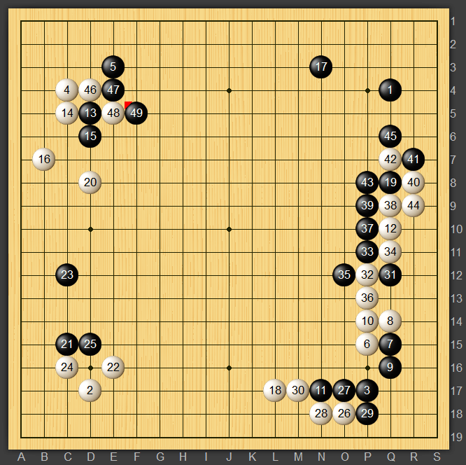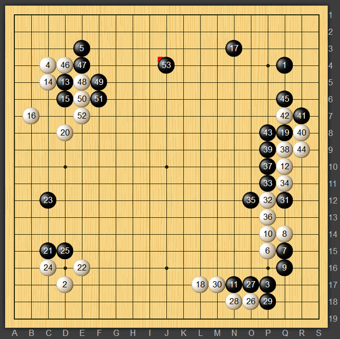 黒45までシチョウで一子を取る別れとなりました。白38で黒31を抱えた形より右上隅が固まった気がするのでこれはこれで良いかなと感じていました。