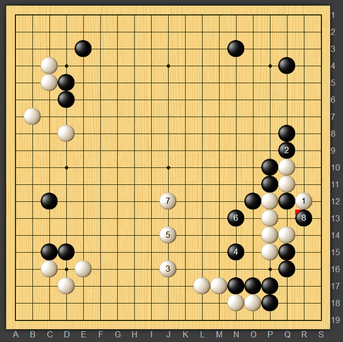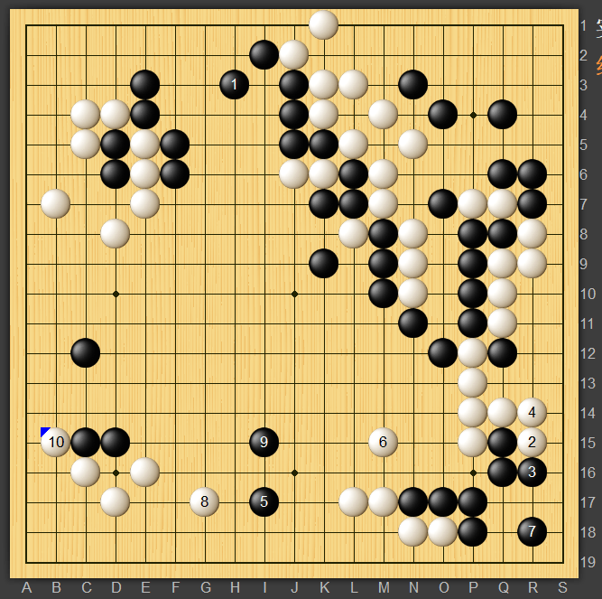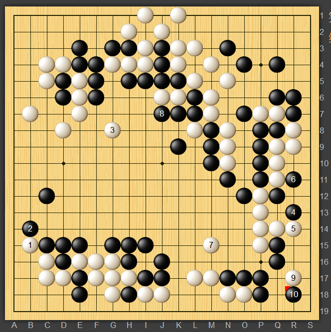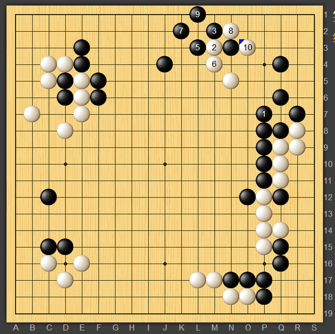 最初に遡るとAIのおすすめはシチョウを解消してシマリへのツケの変化、右辺も味がいいですし上辺の地も固まっていますね。