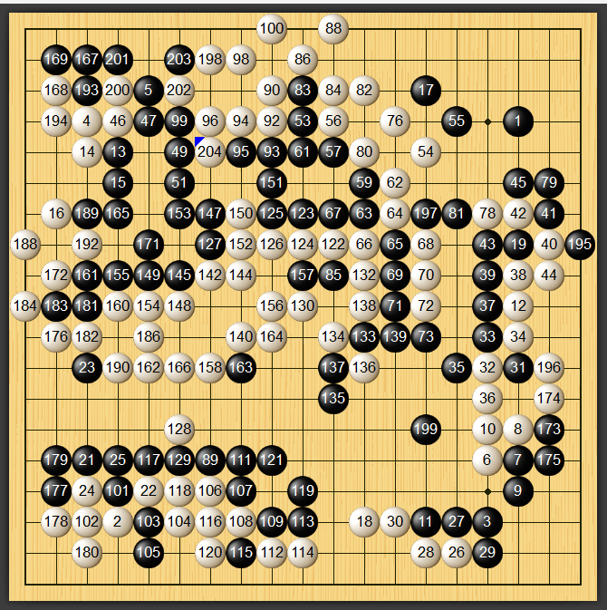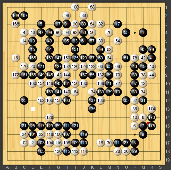 結果的にはシチョウの際に捨てた黒二子が復活。一応利益は上げましたが読み違いがあり黒131,143,141,159は逃げ過ぎてしまいました。ここで白173,175のハネツギが大きいと思ったのですがもっと良い手があった様です。ちなみにこの時点では一応黒が良い模様。