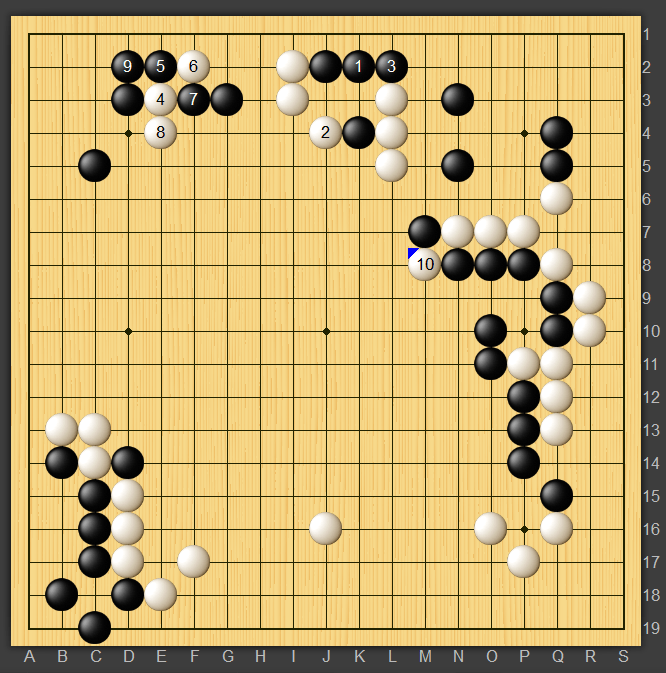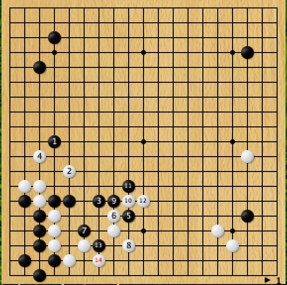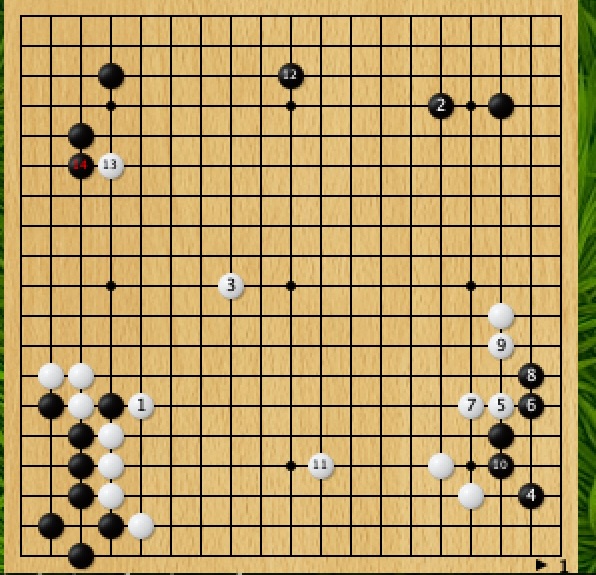 そもそも白もカケツギではなく白1と抱える所だったようです。白模様が大きくて怖いですね。下辺もハサミツケの味があるので荒らしにいくか四隅とっているので囲い合うか迷うところ、私なら入っていって頓死したら終了なので黒も右辺から模様を広げるように打つ気がします。