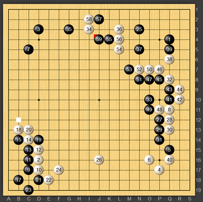 黒59は謎の一手ですね、出ギリを打たれても分断できると思ったらカケで二目取られる手を見落としていたのでしょう笑